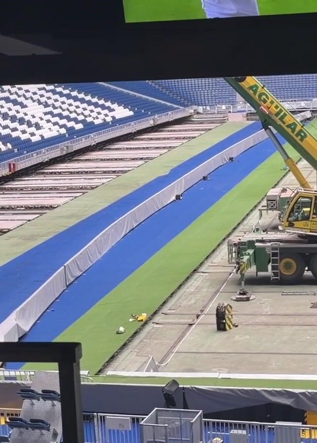 interior of a stadium lounge overlooking the field, which is undergoing some kind of construction