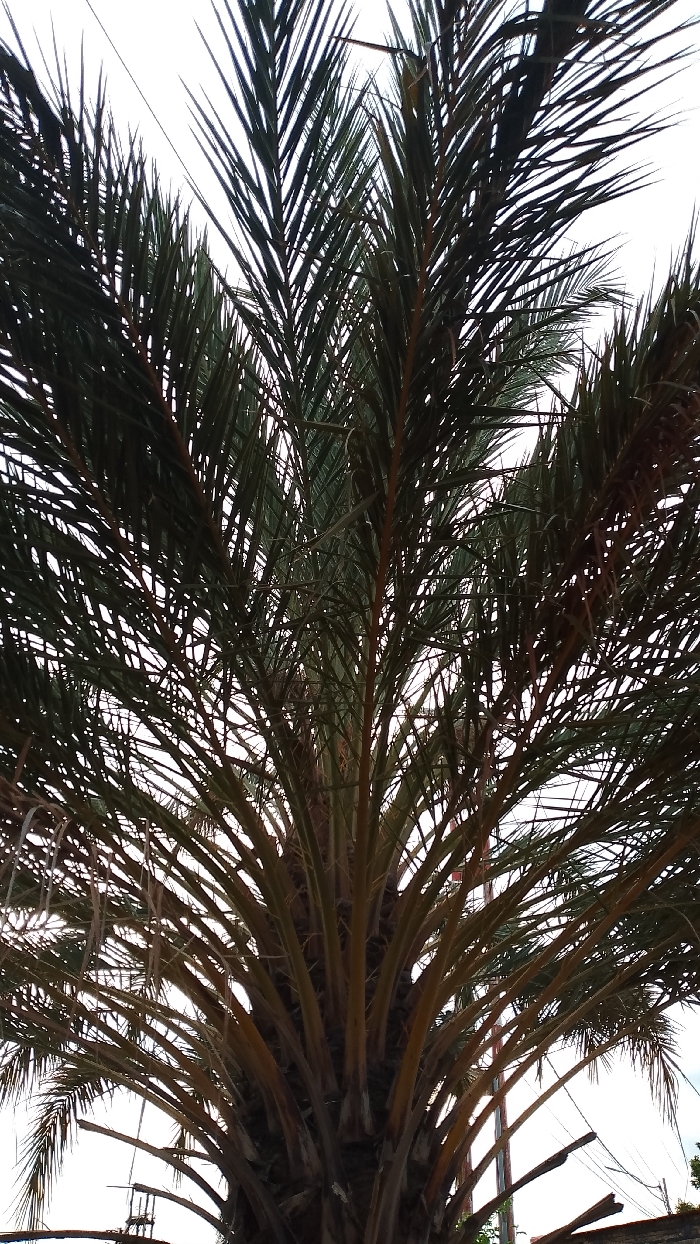 - "The image presents an upward, low-angle view of a palm tree, likely a date palm, centered against a bright, uniformly white sky" by FM-ymGPj1, licensed under CC BY 4.0