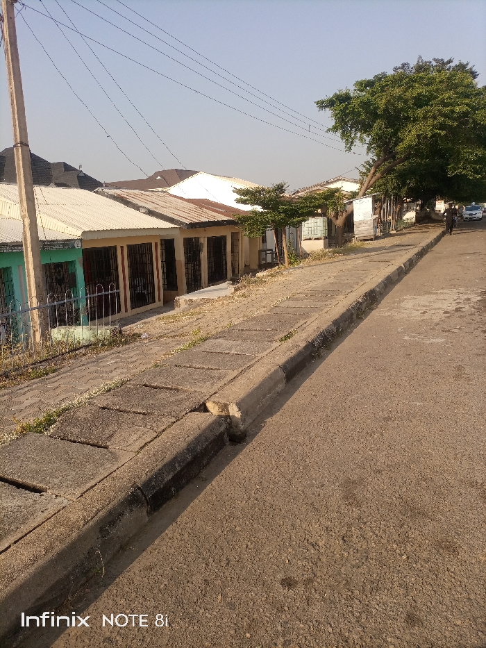 A street scene captures modest, single-story buildings with corrugated metal roofs lining the left side. Security bars adorn windows and doors. A tree with dense foliage hangs over the street on the right. A weathered concrete curb separates the road from a covered drainage system. The asphalt road stretches into the distance. A person and a white car are visible in the background. Overhead power lines run across the sky. The sky is pale blue.