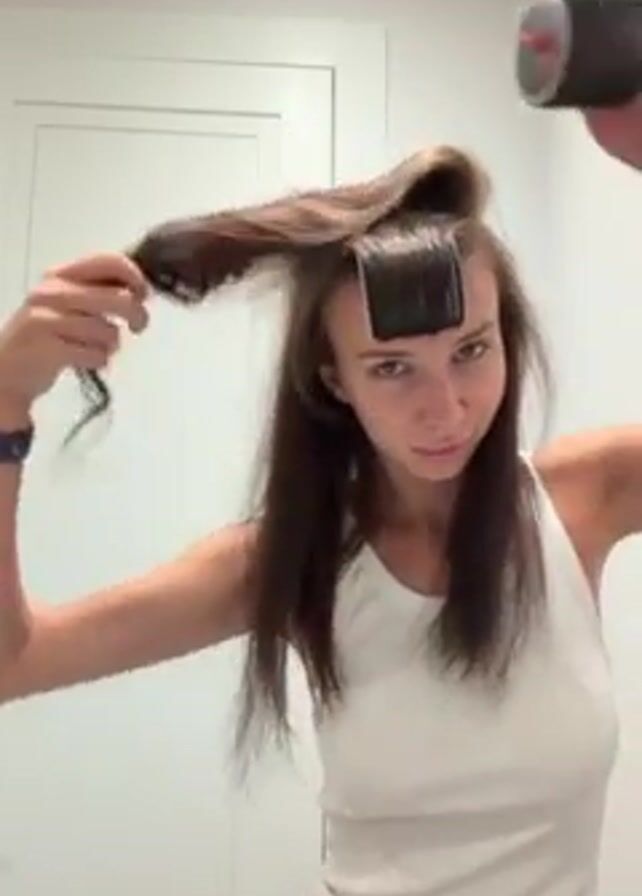 A woman with light brown hair and a white tank top is in a white room, putting hair rollers in her hair. She has one roller across her bangs. She is looking at the camera as she styles her hair. She is wearing a watch on her left wrist. She takes a section of hair and rolls it upward around a hair roller, holding it in place near the top of her head.
