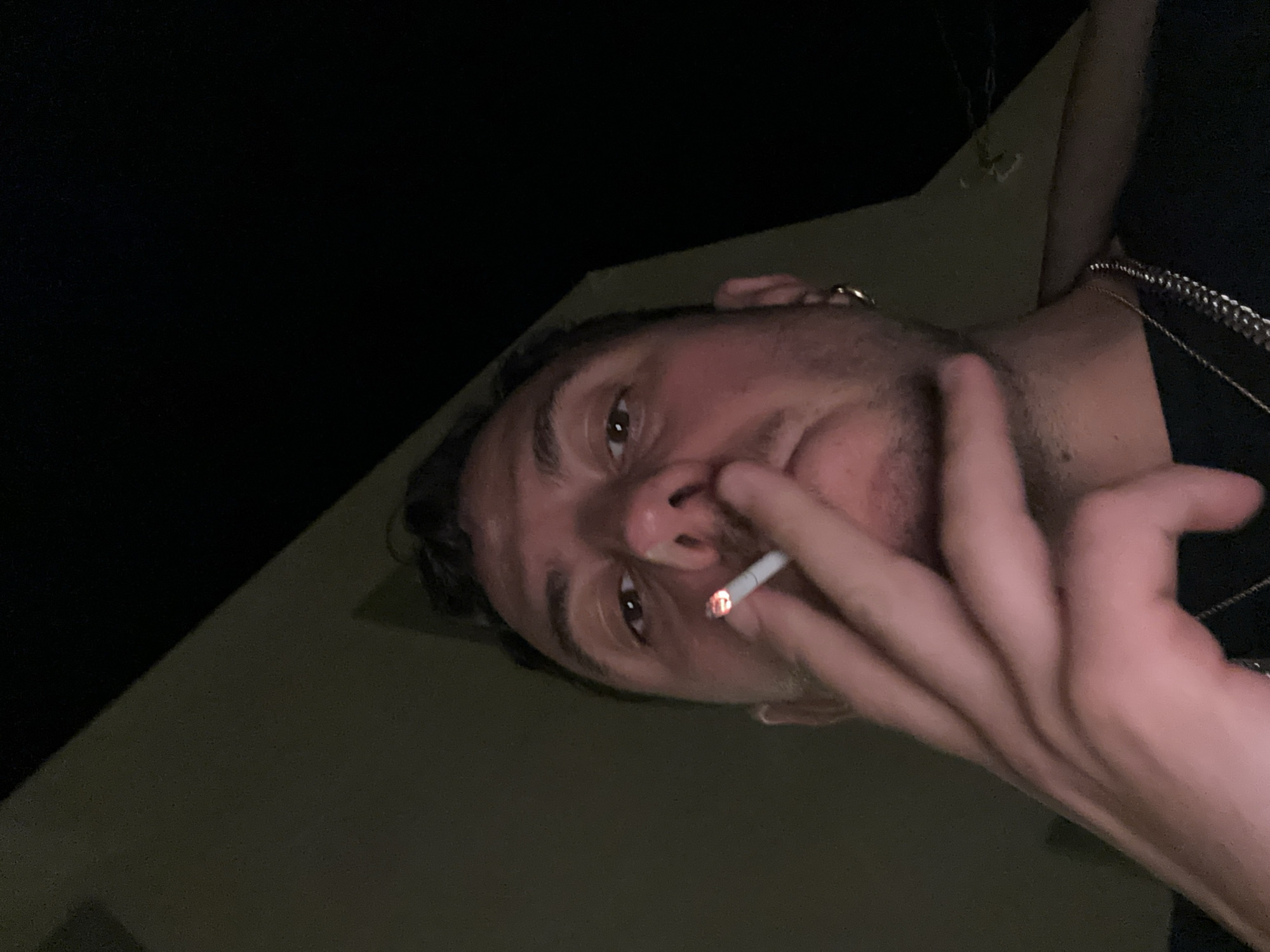 A person is holding a lit cigarette to their mouth. The person has short dark hair, light skin, an earring, and a chain necklace. The person is wearing a black shirt. The background is dark with a light-colored wall visible in the lower left quadrant of the image. It is not possible to determine the specific location in Sant Antoni de Portmany, Spain, from this image alone.