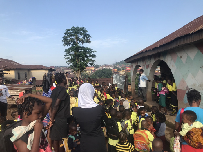 The image depicts an outdoor gathering of approximately 80 individuals, predominantly young children, in Aramoko-Ekiti, Nigeria, under a clear, bright blue sky
