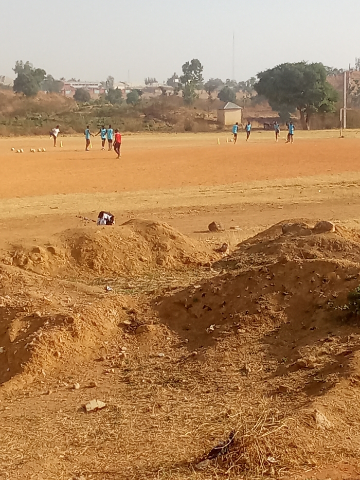 A field of reddish-brown dirt is the scene of a sports practice. In the background, a line of young people in blue shirts practice with balls and wicket stumps. At left, a person in white kicks a ball. To the right, several people run drills. A building and trees are visible in the distance. In the foreground are dirt mounds covered in dry grass.