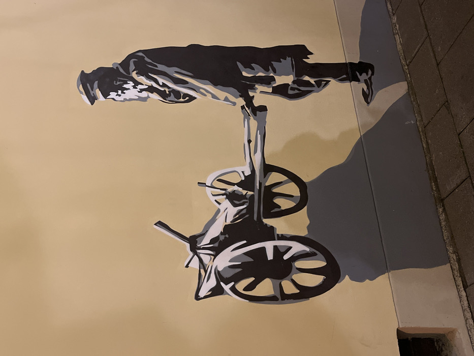 A black and gray stencil art piece is painted on a tan wall. The subject is a man standing on top of a vintage-style, two-wheeled cart. The man is depicted in a dark silhouette, wearing what appears to be a coat and hat. The cart's wheels have a stylized design. The art casts a shadow on the wall beside it.