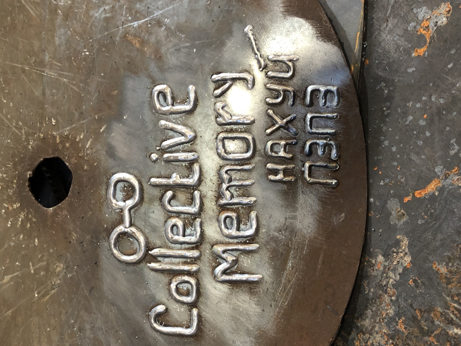 This image, taken in Čeluga, Montenegro, depicts a close-up view of a circular or semi-circular metallic plate, likely steel, with a dull, scratched surface. Near the top center of the plate, a single circular hole is present. Welded onto the plate in raised metallic beads are a series of characters and an icon. At the top, a horizontally oriented icon resembling two conjoined circles or spectacles is visible. Below this, the English words "Collective Memory" are welded in two lines, with "Collective" above "Memory." Further below, two lines of Cyrillic text are welded: "НАХУЙ" on the upper line and "ПЭПЭ" on the lower line. The metallic plate rests on a darker, textured surface exhibiting scattered patches of orange-brown discoloration, indicative of rust or residue. No people are visible.