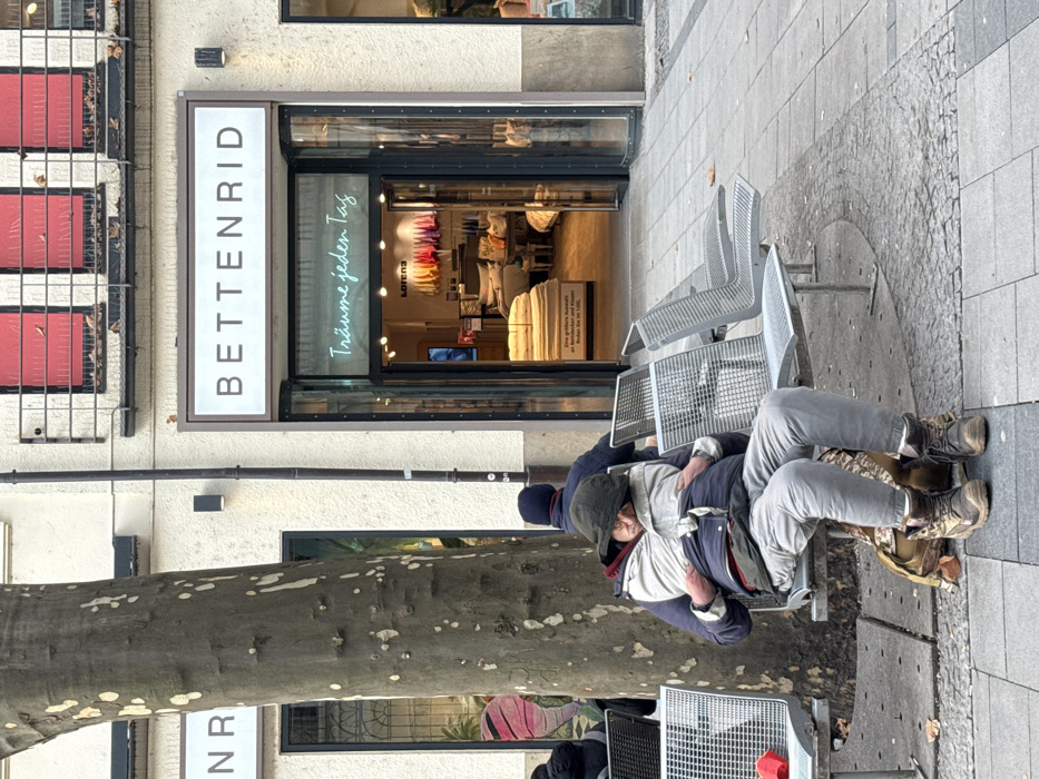 This image depicts a street scene at Neuhauser Str. 12 in Munich, Germany, featuring the storefront of "BETTENRID." In the foreground, a male individual is seated on a metal slatted bench, wearing a dark hooded jacket over a lighter layer, a red undershirt, light grey pants, and brown hiking-style boots. He is slumped forward, appearing to be asleep or resting deeply, with his head covered by his hood and hands resting on his lap. A dark fanny pack is visible across his waist. A camouflage-patterned backpack rests on the pavement between his feet. To his immediate left, the back of another person, wearing a dark blue hooded garment, is partially visible, seated on a similar bench. A large tree trunk with patchy light-colored bark stands to the left of the benches. The paved ground transitions from light grey square tiles to darker grey cobblestones beneath the seating area. In the midground, the glass entrance of the "BETTENRID" store is prominent, with an interior display of bedding products, pillows, and colorful textiles visible. A neon sign above the entrance reads "Träume jeden Tag" (Dreams every day). The store sign "BETTENRID" is displayed above the entrance in illuminated white letters. The building's facade is a light, textured material, with a dark pipe running vertically along its exterior. In the background, above the "BETTENRID" sign, three windows are visible, each equipped with red blinds or awnings and protected by black metal railings. To the left of the store entrance, a partial sign with the letters "N R" is visible, indicating another adjacent business. The sky above is overcast.