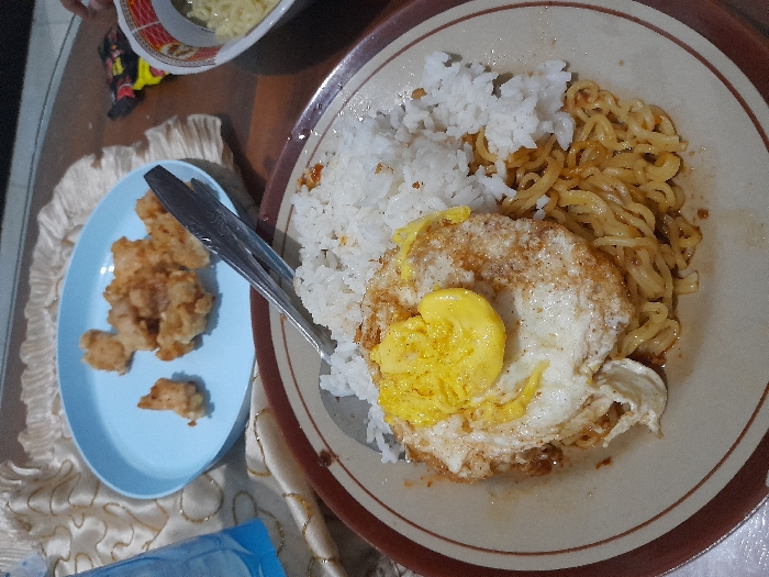 The scene is set indoors, on a wooden table in Gelam, Indonesia. A light brown ceramic plate with a dark brown rim occupies the foreground, holding a meal composed of white rice, brown-sauced instant noodles, and a fried egg topped with a bright yellow yolk. A metal spoon and fork are positioned on this plate. To the left, a light blue plate contains multiple pieces of golden-brown fried chicken. A cream-colored patterned fabric tablecloth partially covers the table beneath the dishes. To the right, a ceramic bowl with a red and gold patterned rim holds yellow instant noodles, and a small black and red packet is visible beside it. A partial blue container is present on the far left. No individuals are depicted.