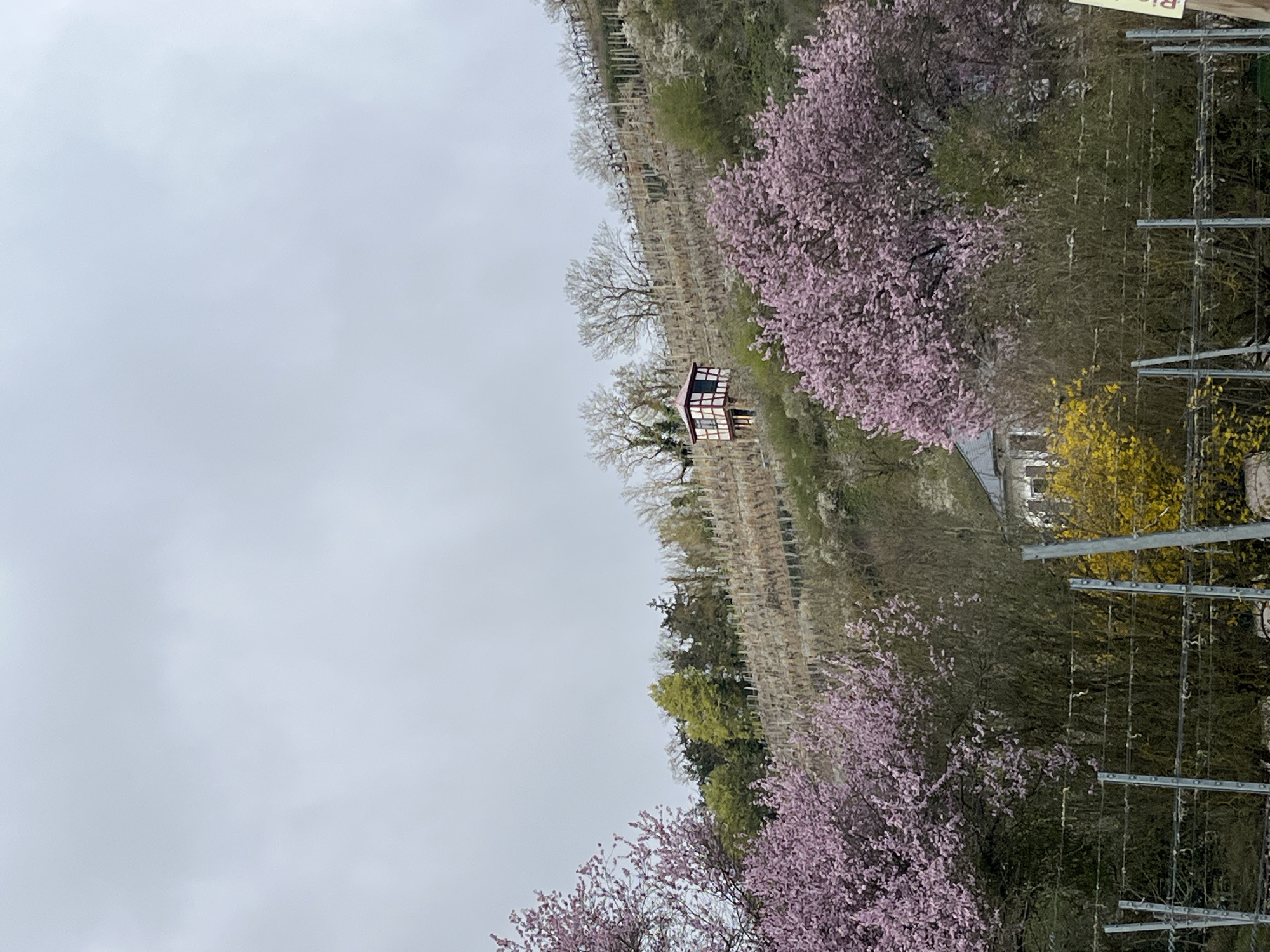 vineyard landscape in Odernheim am Glan, Germany, under a cloudy sky. The terraced rows of grapevines are visible on a hillside, with a small, traditional half-timbered house (likely a "Weinberghäuschen," or vineyard cottage) nestled among the vines. Blooming trees with pink blossoms are interspersed with the vines, suggesting the season is spring. Metal poles and wires, presumably part of the vineyard trellis system, are visible. Yellow flowering bushes are seen near the edge of the vineyard.