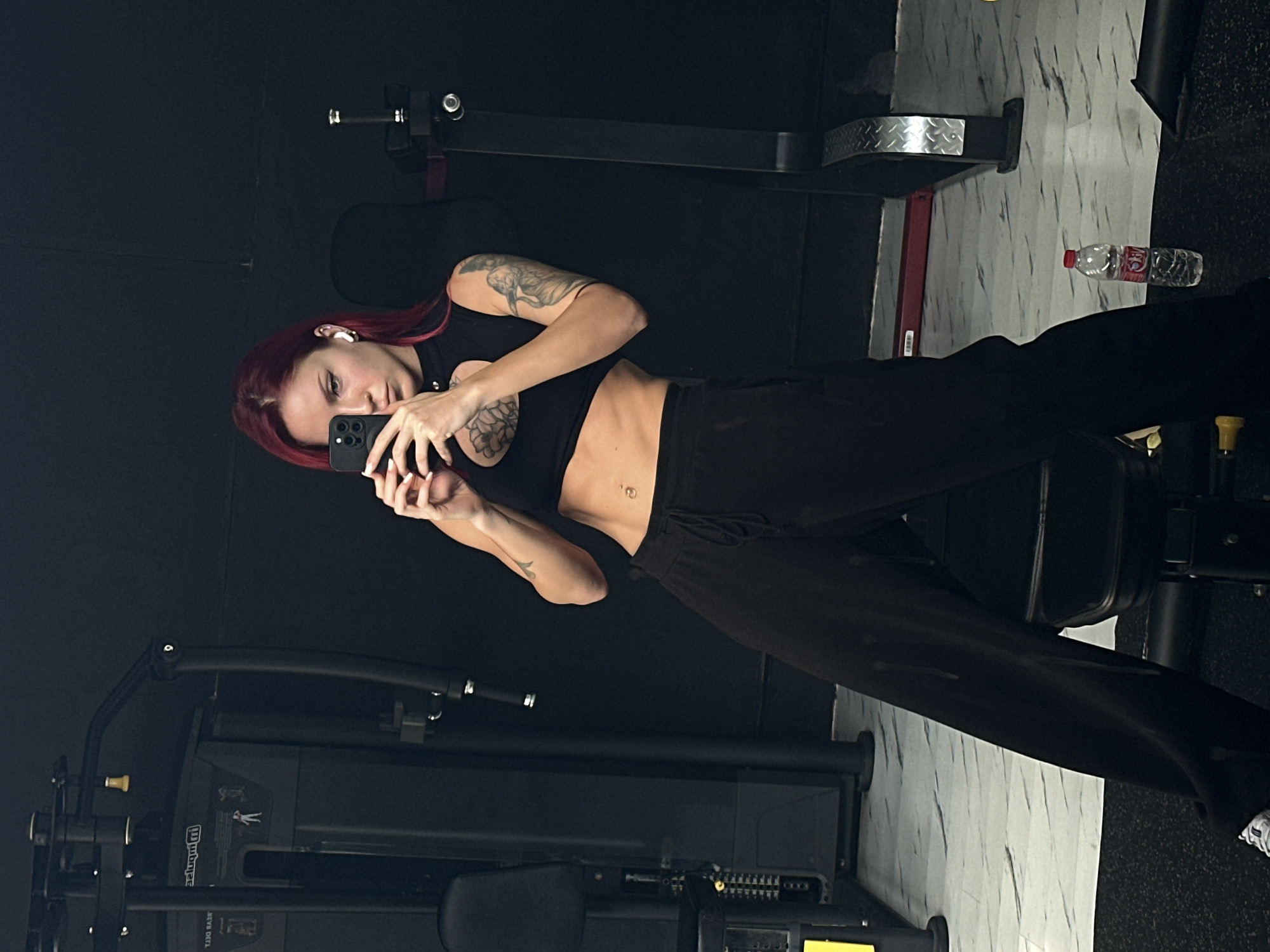 A female subject with red hair is depicted in a gym environment in Kerobokan, Indonesia. She is standing, angled slightly to her left, capturing a selfie using a black smartphone held in both hands. She wears a black sleeveless crop top with a cut-out detail on the chest, black drawstring sweatpants, and white sneakers. White wireless earbuds are visible in both ears. Tattoos are present on her left upper arm, left forearm, and on her chest. A navel piercing is visible on her exposed midriff. The background features dark walls and a floor composed of white and grey marble-patterned tiles transitioning to a black textured mat. To the left, a large black gym machine with a padded seat is visible. To the right, another piece of black gym equipment is present, and a clear plastic water bottle with a red cap rests on the floor.