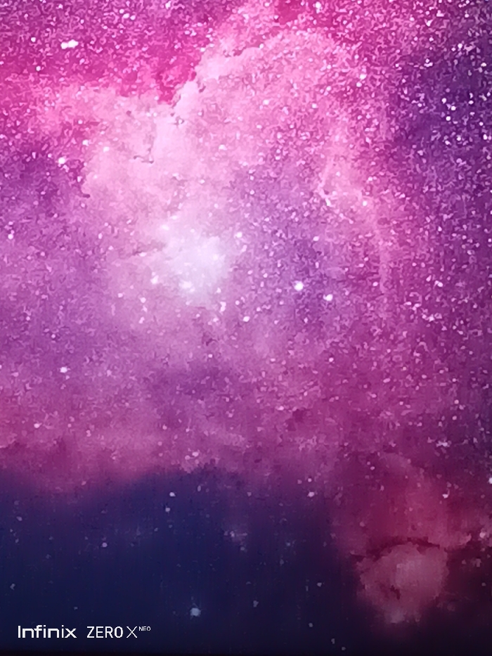 A visually striking galaxy-themed image dominates the frame with shades of pink, purple, and dark blue. Fine particles mimic stardust scattered across the nebulous expanse. In the lower left corner, white text "Infinix ZERO X NEO" is displayed. The overall effect is an artistic rendering of a cosmic vista, perhaps a promotional background or wallpaper.