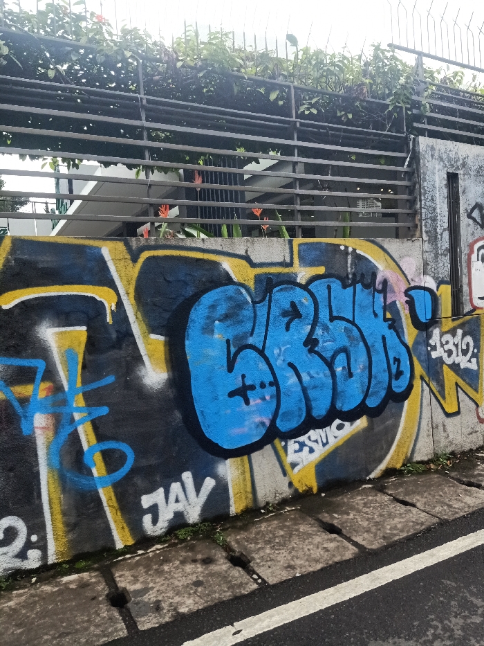 A concrete wall displays graffiti in blue, black, and yellow. Blue graffiti with black outlines reads "GRBTZ." Other tags and markings surround it, including "JAV" and "1312." The wall sits below a metal fence topped with green foliage. The bottom of the wall meets a row of square concrete blocks on a dark asphalt surface, suggesting a street or road edge.