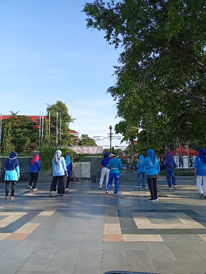 A group of women, most wearing hijabs and blue attire, are participating in an outdoor exercise class on a paved plaza. They are facing away from the camera. A large tree provides shade to the right. Behind them is a building with a red roof, some flagpoles, and a small white building. The sky is clear blue, indicating a bright, sunny day.