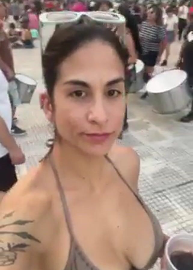 A woman films herself in a public square where a band of people is playing drums. The woman has a brown bikini top, a tribal tattoo on her shoulder, and sunglasses on top of her head. She's holding a drink in a cup. The square is paved and there are buildings in the background. Many people stand around enjoying the drumming. The band is diverse, wearing a variety of casual clothes. They are holding and playing large metal drums. The video appears to have been taken during the day.