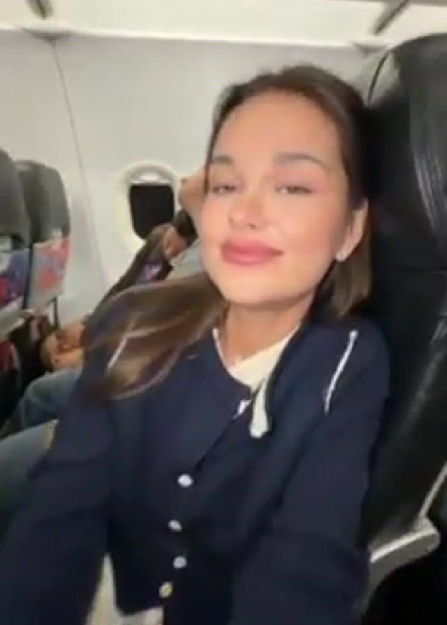 A woman is sitting in an airplane seat, drinking from a green glass bottle. She is wearing a navy blue cardigan over a white top and has dark hair. Other passengers are visible in the background, some sleeping. The plane's interior, including seats and windows, is visible. The woman smiles at the camera, then drinks from the bottle, holding it up as if to show it.