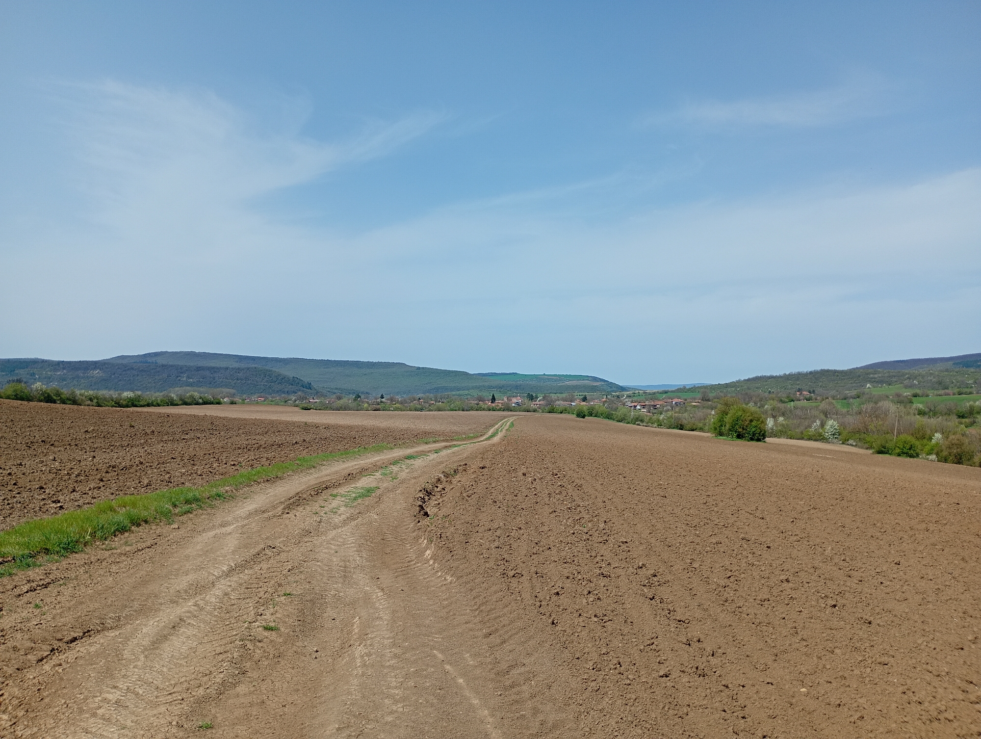 field in Gorsko Novo Selo, Bulgaria, with recently tilled brown soil. A dirt road cuts through the field, showing tire tracks. Beyond the field is a line of vegetation, including trees and shrubs, and a distant view of the village houses with red tile roofs. Rolling hills and a clear blue sky with scattered clouds complete the landscape.