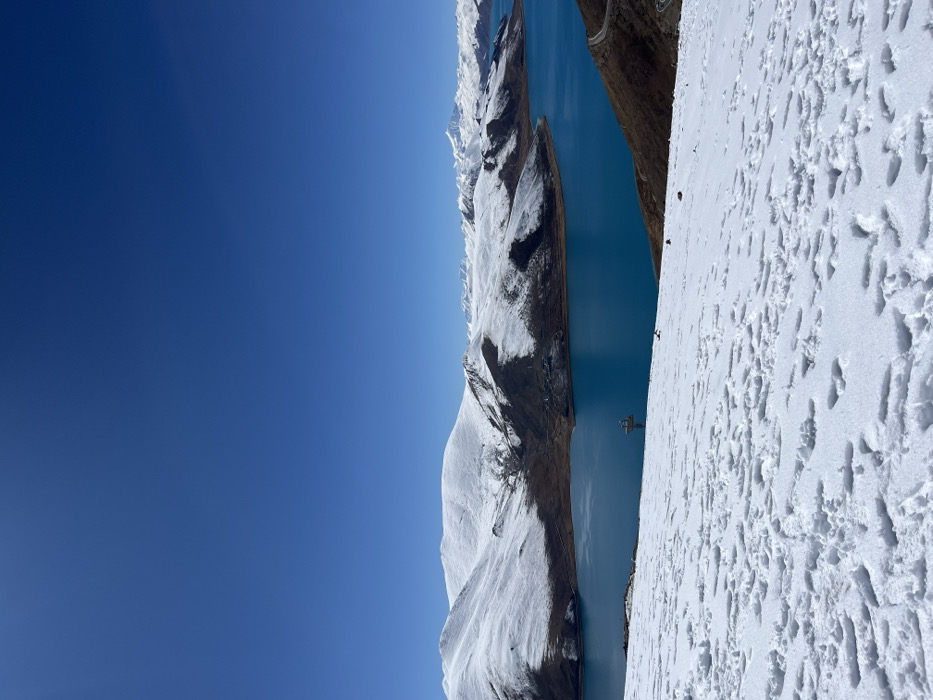 This image depicts a vast, high-altitude mountainous landscape. The immediate foreground features a snow-covered slope exhibiting multiple distinct human footprints. In the midground, a large body of turquoise-blue water, identified as a lake, extends across the frame, bordered by snow-covered mountains that reveal patches of exposed brown earth. A dark, cross-shaped structure on stilts is positioned in or immediately adjacent to the lake, slightly left of the image's vertical center. To the right, a winding, unpaved road traverses a snow-dusted, brown hillside. The background consists of an extensive range of distant, snow-capped mountains under a clear, deep blue sky. The scene is brightly illuminated, consistent with direct sunlight. No individuals or overt actions are visible. This landscape is observed in Baidi, China.