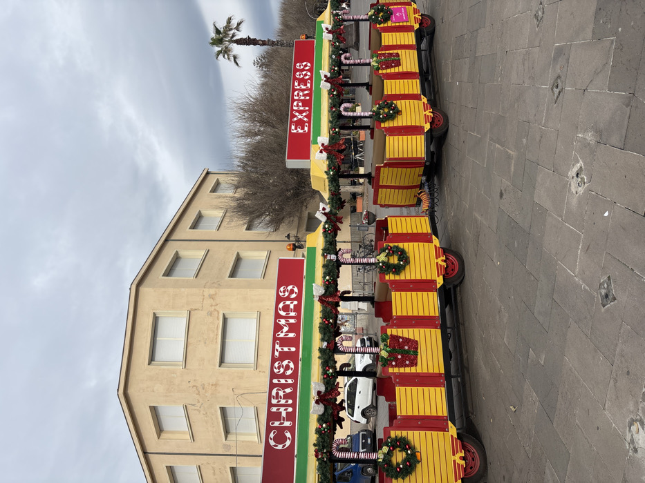 This image captures a static scene in a paved urban square in Alghero, Italy, under an overcast sky. The primary subject is a multi-wagon tourist train, identified as the "Christmas Express," with its front two sections prominently displayed. The train wagons feature a yellow and red slat design, red wheels, and are heavily adorned with Christmas decorations including green garlands, red bows, small white and red baubles, large white and red candy canes, and green wreaths with red berries. The front wagon displays a red sign with "CHRISTMAS" in white candy cane-patterned letters, while the second wagon has a similar sign reading "EXPRESS." An amber warning light is visible on the first wagon's roofline. In the mid-ground, behind the train, stands a light beige, two-story (visible) building with a corner architectural design and multiple rectangular windows, some fitted with white blinds. To the right of the building, several leafless deciduous trees and bushes are visible, contrasting with a tall, slender palm tree further in the distance. Parked vehicles, including a blue van and a white SUV, are partially visible between the trees and building. The foreground consists of large, irregularly shaped grey stone pavers. No individuals are visible on or around the train, nor in the immediate vicinity of the square, suggesting the scene is quiet or observed during off-peak hours.