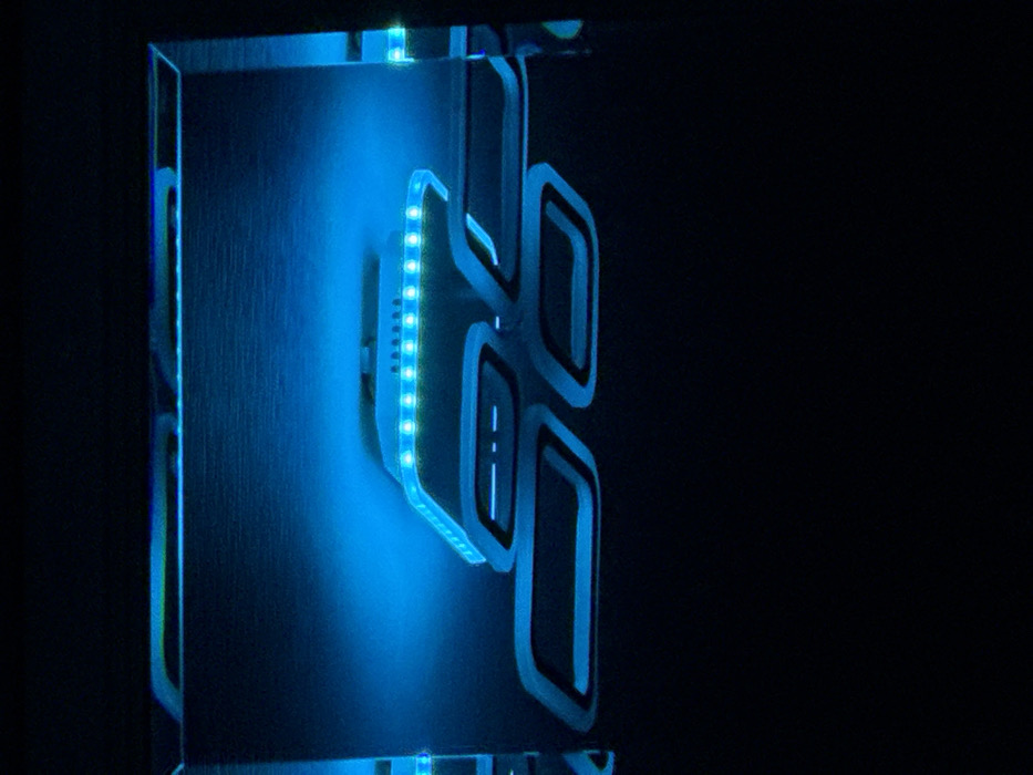 The scene depicts an interior space within the city of Krasnodar, Russia. The image is dominated by a modern, blue-lit ceiling or overhead fixture against a dark background. A central, rectangular white or light-colored panel is positioned overhead, featuring a visible strip of approximately ten distinct, bright blue LED emitters along its front edge. Below this primary panel, and seemingly interconnected, are four smaller, hollow, rectangular fixtures arranged in a 2x2 grid pattern. These secondary fixtures also emit a soft blue glow from their inner perimeters. The top-most fixture shows subtle internal details, including a horizontal line and two smaller dashes. The surrounding surfaces, possibly a ceiling or wall, reflect the blue light, contributing to the overall dark blue ambiance. No individuals, actions, or specific interactions are visible. The environment appears to be an architectural feature or decorative lighting installation.