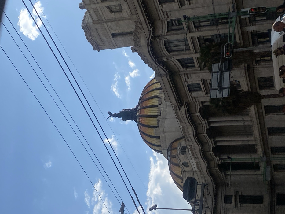 The image displays an exterior view of the Palacio de Bellas Artes in Mexico City, Mexico, situated under a partially cloudy blue sky. The building's central dome, featuring vertical gold and orange-brown segments, is prominently visible. A dark, winged figure, likely a Pegasus statue, surmounts the dome's pinnacle. The ornate light-colored stone facade, detailed with columns and arched windows, extends across the midground. Several black overhead utility wires crisscross the sky. In the lower foreground, portions of a street-level environment are visible, including a red traffic light, a multi-lane traffic signal arm, multiple palm trees, parts of a white vehicle, and the upper bodies of several individuals on what appears to be a sidewalk or street.