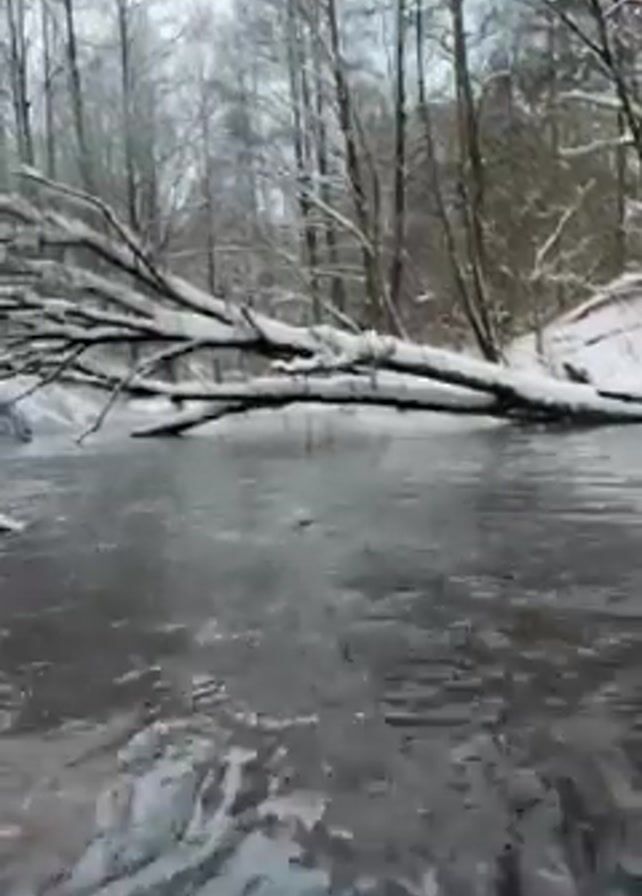 The camera is positioned close to the surface of a flowing river, capturing the movement of the water. The surrounding environment is a snow-covered forest, with trees lining the banks of the river. A fallen tree stretches across the river, its branches covered in snow. The scene suggests a wintry, natural setting.