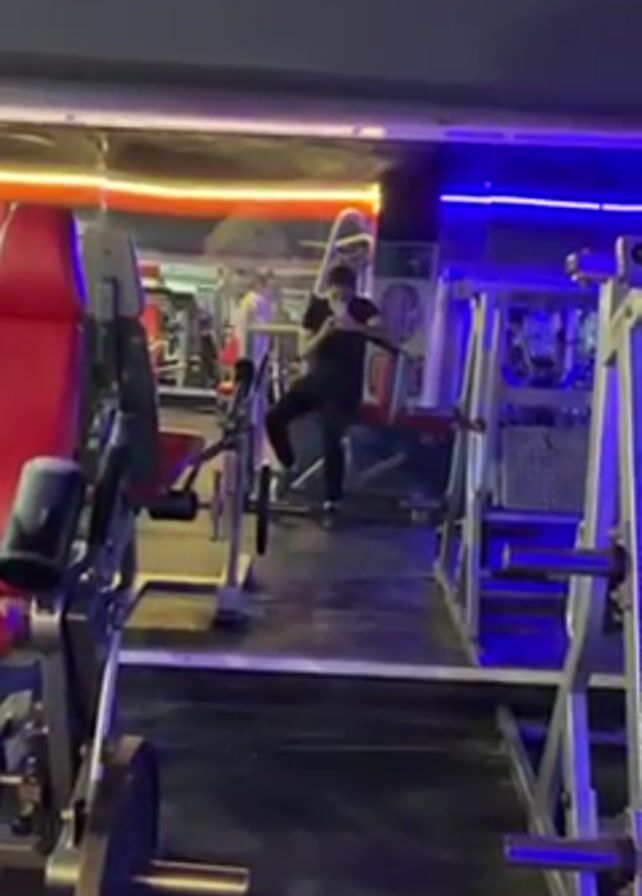 In a gym setting, the camera focuses on a man using his phone in front of a mirror