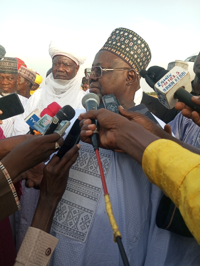 A man wearing a blue shirt with a patterned design and a black and white patterned cap is being interviewed by a group of reporters. He is surrounded by at least four reporters, all holding microphones and cameras. The reporters are mostly obscured by the man's shoulders. The reporter on the left is holding a microphone with a "TV" logo on it. The reporter on the right is holding a microphone with a "Equity FM 103.5 Birnin Kebbi" sign on it. There is a man behind the interviewed man, wearing a white robe with a white patterned headscarf. The man is looking at the interviewer. The scene is outside in a dusty, outdoor setting. The coordinates provided are for a location in Amburse, Nigeria. It is unclear exactly where in Amburse the scene is taking place.