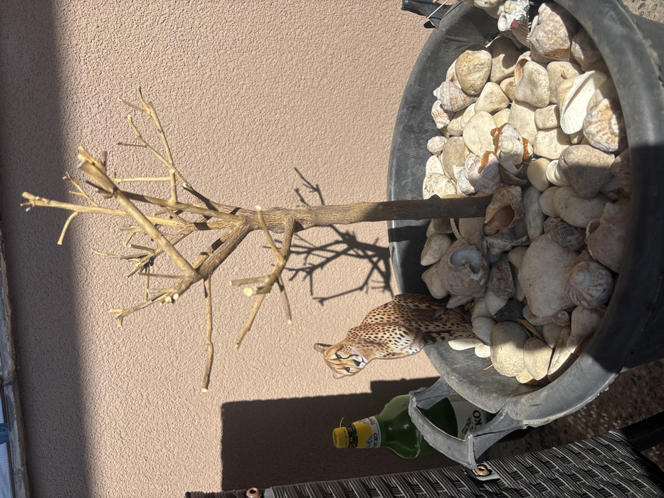 The scene depicts an outdoor balcony or patio area in Unknown, Unknown. A leafless, pruned deciduous tree with numerous cut branches stands centrally within a large, black plastic planter pot. The pot's interior surface is covered with a mixture of light-colored pebbles and various seashells. Positioned among these elements, to the left of the tree, is a two-dimensional cutout figure of a cheetah, appearing to face the viewer. To the immediate left, a green glass bottle with a yellow cap and partially visible white label (featuring Cyrillic text) rests against the side of the pot, adjacent to dark woven wicker furniture. The background is a textured, light brown stucco wall, strongly illuminated by direct sunlight, which casts distinct shadows from the tree and other objects.