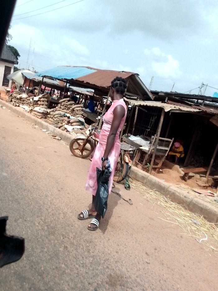 The image displays an outdoor market area under an overcast sky, situated on a reddish-brown dirt road in an unspecified city. In the immediate foreground, a dark-skinned female, viewed from the chest up and oriented to her right, stands on the roadway. She wears a sleeveless, high-necked pink and white patterned midi-dress, black-and-white striped slide sandals, and a black watch on her left wrist. Her dark hair is styled in multiple small knots or braids. She holds a black plastic bag in her left hand. To the right of the subject, a bustling market lines a curb. This area features numerous open-air stalls constructed with wooden frames and covered by corrugated metal roofs, some rusted brown, others painted light blue. Along the roadside, large quantities of yams are piled on the ground, alongside several white sacks. A motorcycle with a prominent brown front wheel is parked near these goods. Further into the market, a bicycle leans against a stall. Several individuals are visible within the stalls; one person, dressed in yellow, is seated within a stall on the far right. The stalls contain various market goods and basic wooden structures. The environment suggests an active, unpaved marketplace.