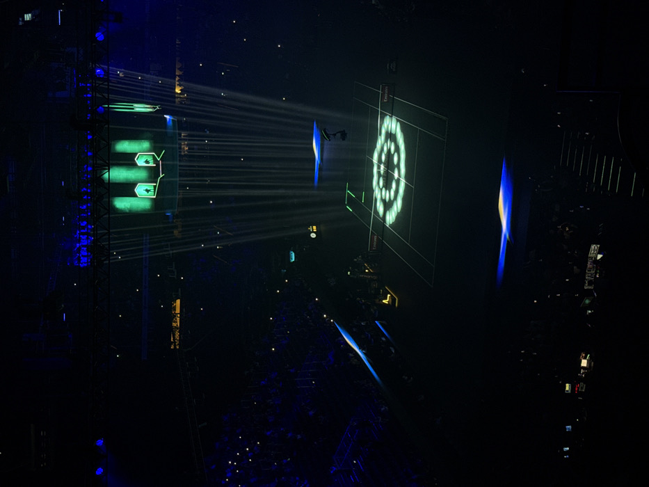 An indoor sports arena in Nanterre, France, is depicted from an elevated perspective during a nighttime event. The expansive venue is predominantly dark, with illumination provided by theatrical lighting in hues of blue, green, and white. At the center of the image, a standard tennis court is clearly visible, delineated by white lines and bisected by a net. A large, circular pattern of white lights is projected onto the court's surface, particularly around the service boxes. Advertising boards for "Emirates" are positioned along the net. High above the court, a large, rectangular video screen displays a green graphic composed of three stylized, arch-shaped elements. Two of these elements contain distinct human silhouettes, consistent with tennis players in action. Numerous strong white light beams descend vertically from the ceiling structure above this screen, piercing through the dark atmosphere and converging towards the court. Additional colored light projections are present, including a wide blue light streak on the floor in the mid-ground and subtle green outlines accentuating parts of the court. The surrounding multi-tiered stands are populated by spectators, many of whom are holding up illuminated devices, creating a scattered pattern of bright points against the dark seating areas. In the lower left foreground, an area featuring multiple illuminated screens and technical equipment suggests a control or commentary station.