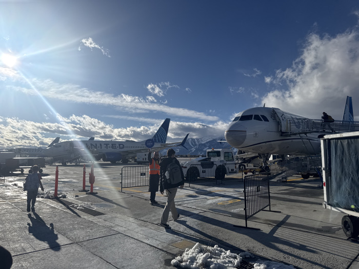 A sunny, daytime view of an airport tarmac with two United Airlines planes. One plane has passengers exiting via stairs. People walk across the tarmac, including airport personnel in orange vests. Baggage carts and a small airport vehicle are present. Snow is visible on the ground. Mountains are visible in the background, partially obscured by clouds. The sun shines brightly, casting strong shadows.