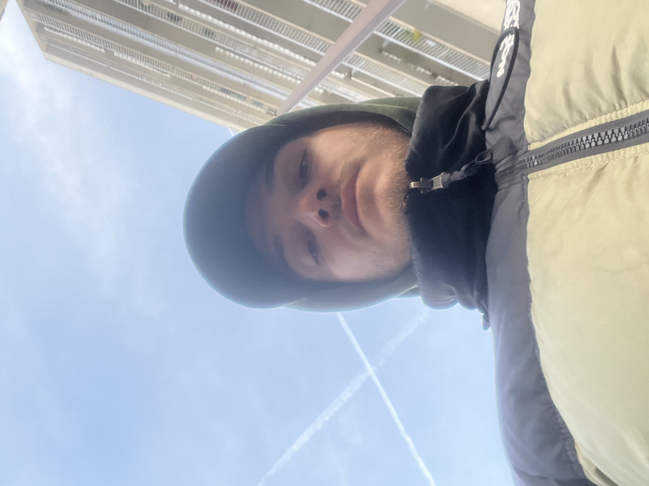 The image displays a head-and-torso shot of a male individual, captured from a low-angle perspective, consistent with a selfie. The subject, an adult male with short facial hair, is positioned centrally, looking directly into the camera with a neutral expression. He is wearing a dark green baseball cap, a dark green hooded sweatshirt, and a puffer jacket that is dark grey or black on the upper section and light green or beige on the lower section. The jacket features a visible zipper and a black collar element. The background consists of a clear, light blue sky in the upper left quadrant, exhibiting several white contrails, some of which intersect to form an "X" pattern. To the right, a tall, multi-story building with a light-colored facade and multiple rows of balconies or windows is partially visible, extending upwards from behind the subject. The building's architecture appears modern. The environment is an urban outdoor setting. While the request specifies Paris, France, the visual information provided by the building's generic modern design and the sky does not offer unique identifying landmarks to precisely determine a specific location within Paris.