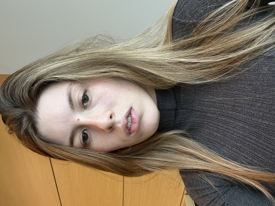 A fair-skinned young woman with long, light brown and blonde hair gazes directly at the viewer. She has light green eyes, and a small mole is visible near her nose. Her expression is neutral. She is wearing a charcoal grey turtleneck sweater. A light wooden wall or furniture panel is partially visible in the background on the left side of the image. The photo is slightly rotated counter-clockwise.