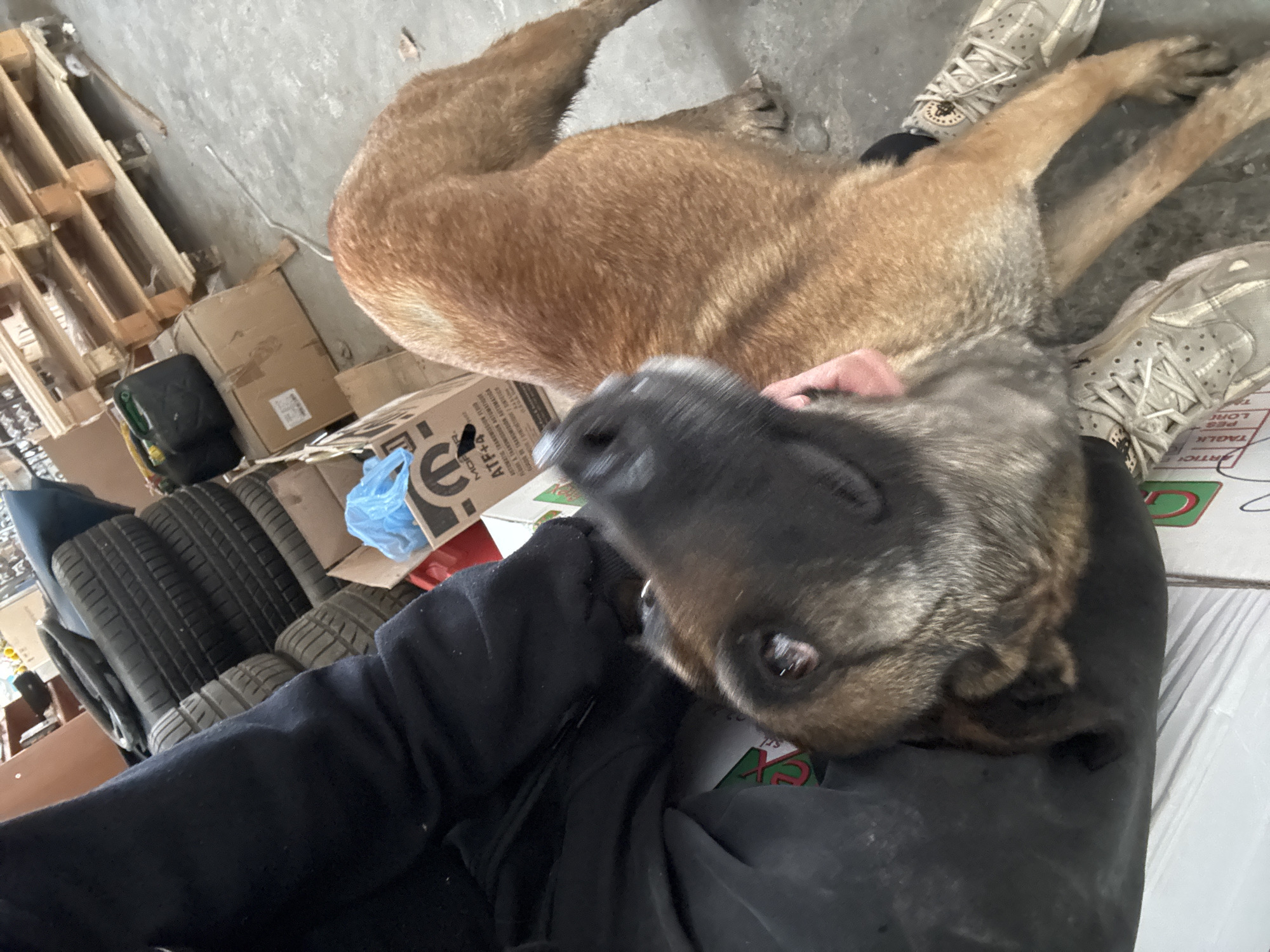 - "A close-up, high-angle shot shows a tan and black Belgian Malinois dog lying on its back, with its head near a person wearing a black jacket" by FM-USzW13, licensed under CC BY 4.0