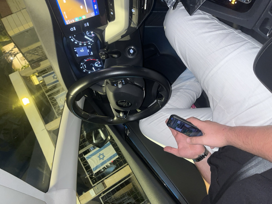 The image captures the interior of a vehicle at night, viewed from the passenger perspective towards the driver's side, within Rishon LeZion, Israel