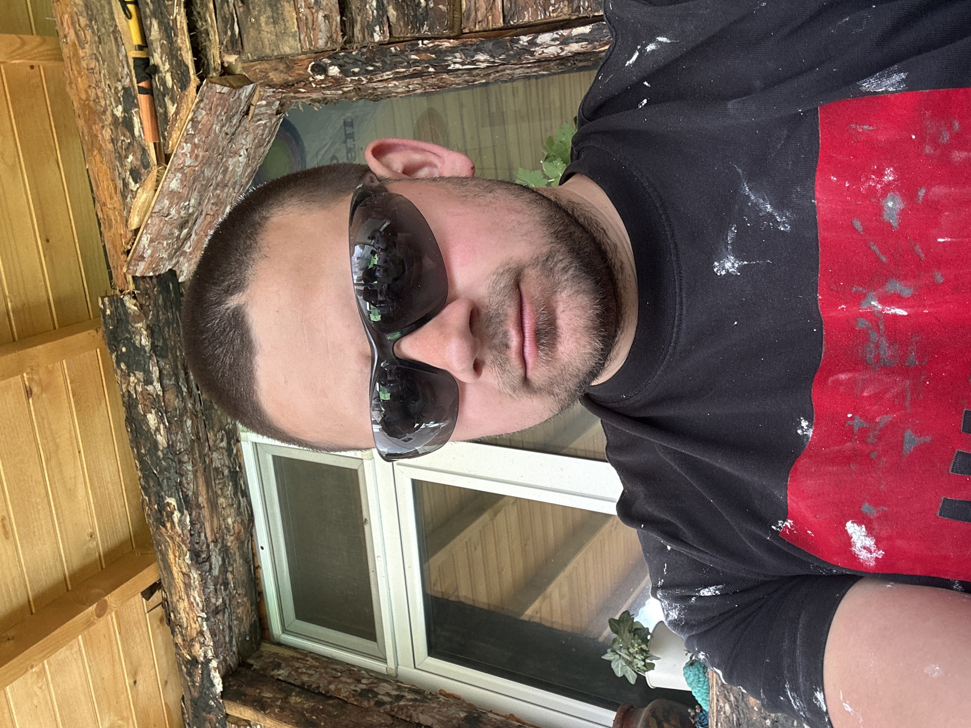 A man wearing sunglasses and a black t-shirt with red and white paint splatters poses for a selfie indoors. He has short hair and a beard. Behind him, a window with a white frame is visible. The window overlooks a wooden structure. The surrounding construction uses rough-hewn wooden beams with bark intact. There is no evidence to confirm that the location is Iabalkovo, Bulgaria.
