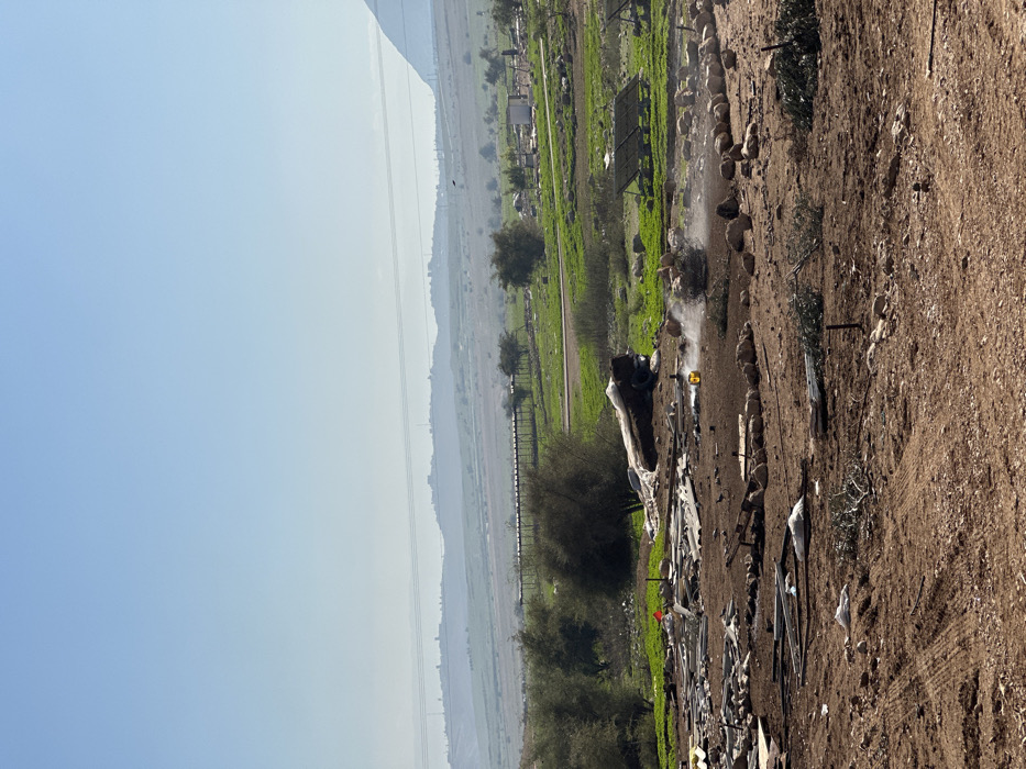 The image displays an outdoor scene in an unknown location within Palestinian Territory, characterized by a clear blue sky. The foreground consists of disturbed brown earth covered with scattered debris, including corrugated metal sheets, wooden fragments, white bags, and cut branches. A small, smoldering pile emits white smoke near the center of this area, adjacent to a yellow object. A semi-circular arrangement of stones is present on the right side of the foreground. Tire tracks are visible on the bare earth in the bottom left. In the midground, a strip of vibrant green vegetation contains scattered shrubs and small trees. A horizontal, multi-columned structure, resembling a fence or support system, runs through this green area. Further to the right in the midground, dark rectangular panels, possibly solar panels, are visible. The background features hazy, undulating hills with faint structures and power lines. A prominent, light-colored, triangular mountain peak dominates the far right of the distant background. No people are visible.