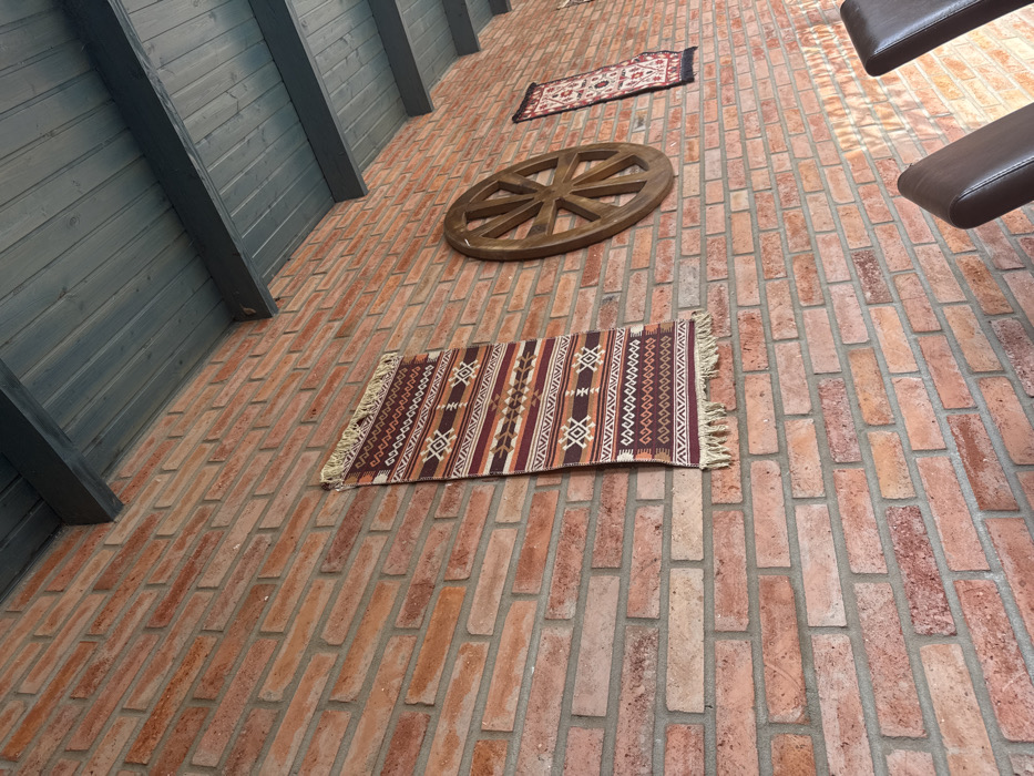 The image displays an interior or covered exterior space, reportedly located in the city of Velebi, Georgia. A prominent reddish-brown brick wall occupies the majority of the frame, constructed with horizontally laid bricks and grey mortar. Above the wall, a dark blue-grey painted wooden plank ceiling, supported by matching wooden beams, extends from left to right. Three distinct decorative items are mounted on the brick wall: 1. On the left, a rectangular woven tapestry, approximately 0.8 meters in length, features geometric patterns in shades of maroon, brown, and off-white, with white fringes at its upper and lower edges. 2. To the right of the tapestry, a circular wooden wagon wheel decoration, approximately 0.7 meters in diameter, is affixed. It consists of a central hub and eight radial spokes. 3. Further to the right, a second, smaller rectangular woven tapestry with similar colors and geometric patterns is visible. In the lower right foreground, the upper backs of two dark brown upholstered chairs are partially visible, indicating a seating arrangement. No individuals are present in the scene, and no actions or interactions are depicted.