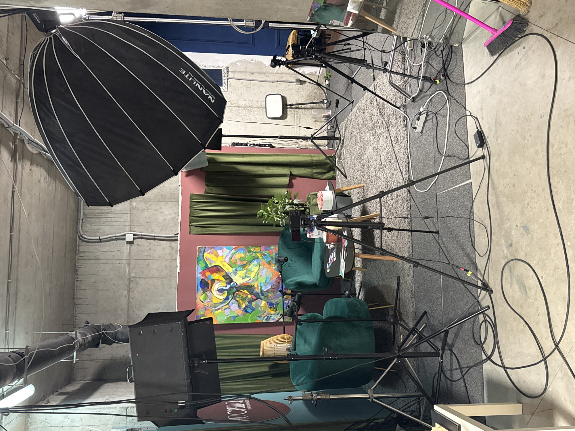 This image displays an unoccupied indoor studio setup located in Sofia, Bulgaria. The environment features exposed concrete walls and ceiling, with visible grey ventilation ducts, electrical conduits, and a fluorescent strip light in the upper left. The floor is a mix of concrete in the foreground and a light gray shag rug covering the central area where the main scene is set. The primary setup consists of two emerald green velvet armchairs positioned facing each other, suggesting an interview or discussion arrangement. Between the armchairs are two small, dark-topped round tables. One table holds a white cake stand with several pink-colored items (possibly pastries or floral decorations) and a potted green plant. The other table displays a red cup, a white plate, and several colorful, circular objects. Directly between and slightly above the armchairs are at least two small black microphones mounted on boom arms, oriented towards the seating. A black video camera is secured on a black tripod in the foreground, aimed at the armchairs. The backdrop features a maroon-painted wall section flanked by two dark green velvet curtains. A large, abstract painting, vibrant with greens, yellows, reds, and blues, depicting an ambiguous form, hangs on this maroon wall. To the far left, a large, round teal sign with white Bulgarian text reading "НАД СРЕЩА" ("NAD SRESHTA") is visible. A light-colored, woven cylindrical lampshade on a stand is positioned behind the left armchair. Studio lighting equipment includes a large black Nanlite Forza 150 parabolic softbox on a stand to the right, a rectangular black LED panel on a stand to the left, and a smaller white LED panel on a stand further back against the concrete wall. Numerous black power and audio cables are strewn across the concrete and rug, connecting various equipment. Multiple white power strips are visible on the floor. In the lower right corner, a pink broom leans against a reflective surface, possibly a mirror or large glass panel.