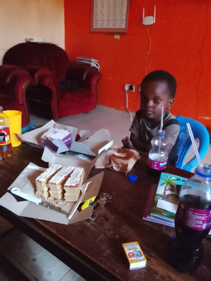 A young child sits at a wooden table laden with food and drinks. Cut cake slices sit in cardboard containers, alongside a purple-colored cake. Two plastic bottles, one filled with a pink liquid and the other with a dark beverage, each have straws sticking out. A children's book rests next to the drinks. A small box with an elephant image is also on the table. In the background, a red armchair and a blue plastic chair are visible, set against an orange wall.