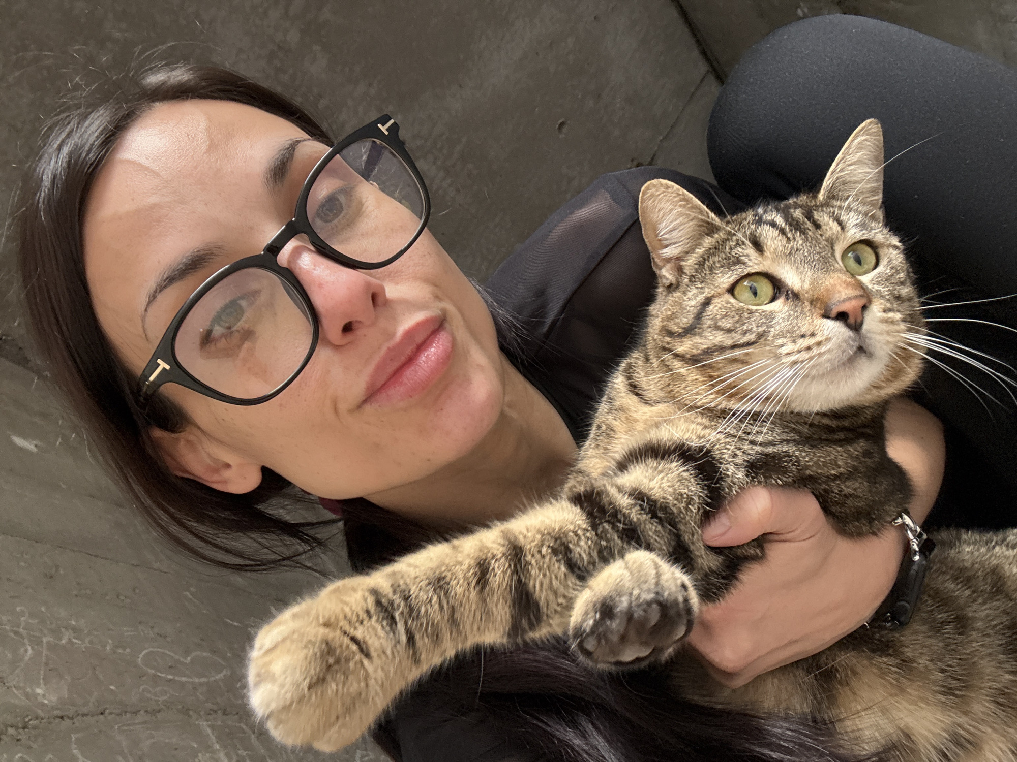 A close-up, high-angle selfie-style image captures an adult female in Pleven, Bulgaria, holding a tabby cat. The female has dark hair, wears black-rimmed glasses with a visible 'T' logo on the temples, and a dark, possibly sheer, top. Her lips are slightly pursed, and she looks directly into the camera. She holds a brown and black striped tabby cat with green eyes; the cat's head is tilted, and it also looks towards the camera. Its front left paw is extended upwards, and a black collar with a metallic clasp is visible around its neck. The background consists of a textured grey concrete wall with some faint white markings. A portion of the female's leg, clad in black leggings, is visible in the lower right quadrant of the image.