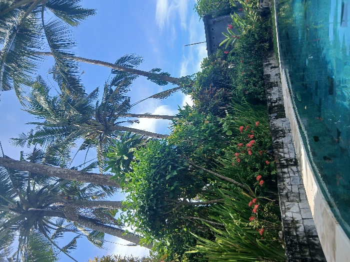 This image depicts an outdoor tropical landscape in Tibubiyu, Indonesia, under a clear blue sky with sparse white clouds. In the foreground, a curved swimming pool with clear turquoise water occupies the bottom right and center, bordered by a light-colored coping. Submerged steps are visible on the right side of the pool. Immediately behind the pool, a retaining wall constructed from irregular grey stone blocks, exhibiting weathering and dark stains, forms a barrier. Above and behind this wall, dense tropical vegetation is present, featuring various green plants, some with long blade-like leaves, and bushes displaying clusters of small red flowers. Further back and towering over the foliage are multiple tall palm trees, primarily coconut palms, with their fronds extending towards the sky and some visible coconuts among the leaves. On the far right, a dark, weathered concrete structure is partially visible behind the trees. No people or animals are present in the scene.