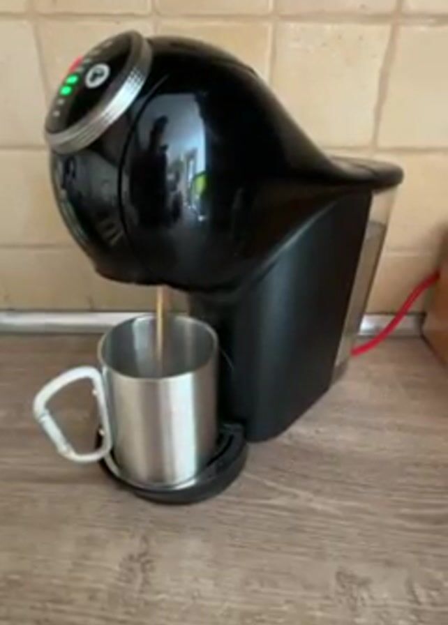 - "A black coffee maker is shown on a wood-like counter in front of a tile wall, filling a metal mug with coffee" by FM-g28Uo1, licensed under CC BY 4.0