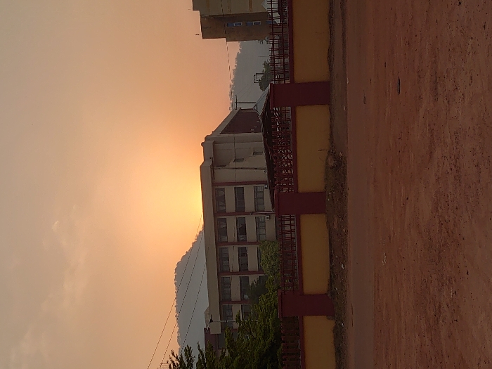 The image displays an outdoor scene in Lokoja, Nigeria, at sunrise or sunset, under an orange and yellow gradient sky. The foreground consists of a reddish-brown unpaved road. In the midground, a concrete perimeter wall is present, featuring yellow painted lower sections, reddish-brown pillars, and a dark metal fence atop it. Behind this wall, on the left, green foliage is visible. In the background, a light-colored multi-story building with numerous windows, appearing to have at least four visible floors, stands prominently. To its right, a partially visible, darker multi-story building is also present. A range of mountains forms the distant horizon, with the sun positioned low, casting a bright orange glow behind the buildings and mountains. Overhead power lines are visible in the upper left portion of the sky. No individuals are present within the scene.