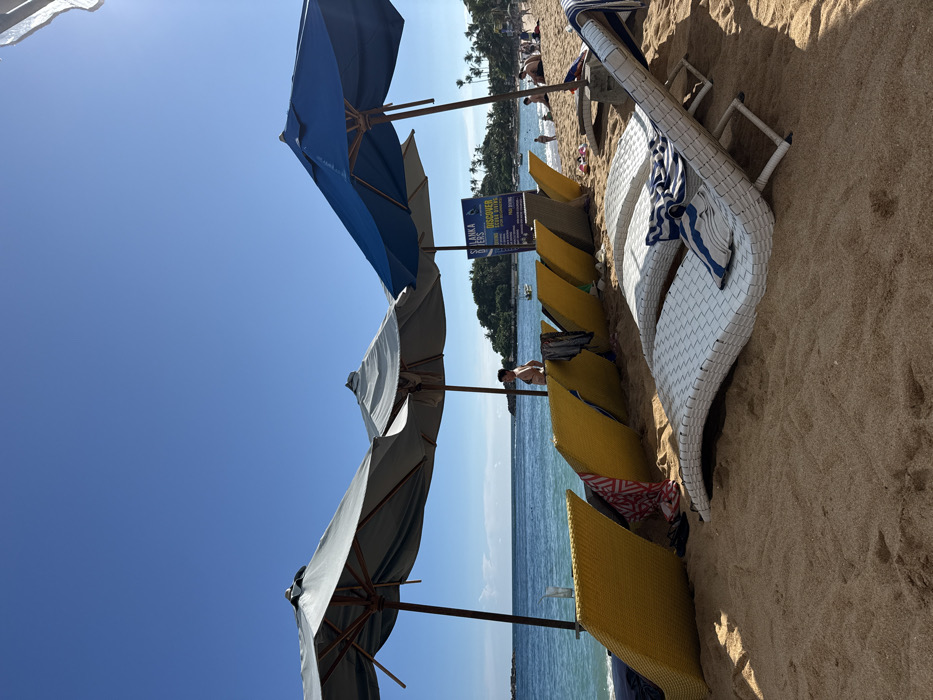 This image captures a daytime beach scene in Rumassala, Sri Lanka, under a clear, bright blue sky. The foreground consists of light brown sand, upon which two white sun loungers with a woven texture are positioned, angled towards the ocean. A blue and white striped towel is draped over the headrest of the closer lounger, with a smaller striped item on its seat. Behind these, a line of several yellow sun loungers faces the water. Overhead, three light grey and one blue beach umbrella provide shade. A red and white striped towel is visible on one yellow lounger, and a pair of black flip-flops rests on the sand nearby. Towards the left-midground, a person, appearing to be female and wearing a dark bikini top, stands in shallow ocean water, facing the sea. The calm blue ocean extends into the background, with several indistinct dark shapes possibly representing other swimmers or objects. A dark blue vertical sign partially reads "SRI LANKA DIVERS" and advertises "DISCOVER SCUBA DIVING." A tree-covered headland with some distant structures is visible across the bay, with several small boats anchored in the water. To the right, further down the sandy beach, additional individuals are observed sitting or standing amidst palm trees. The horizon where the sky meets the sea is clear and distinct.