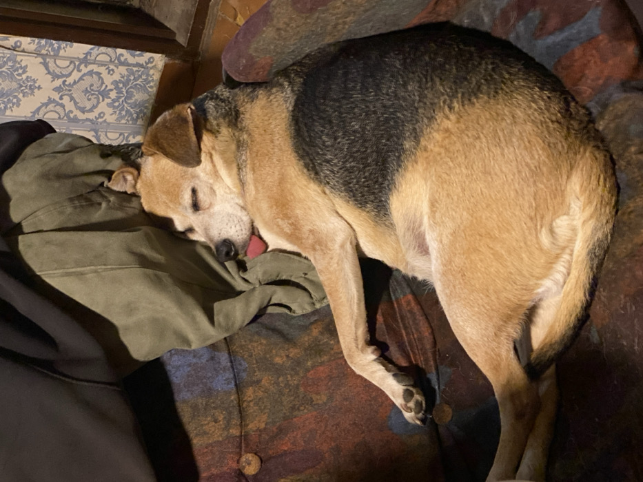- "A dog sleeps soundly on a patterned couch, resting its head on a folded green jacket" by FM-uji6n1, licensed under CC BY 4.0