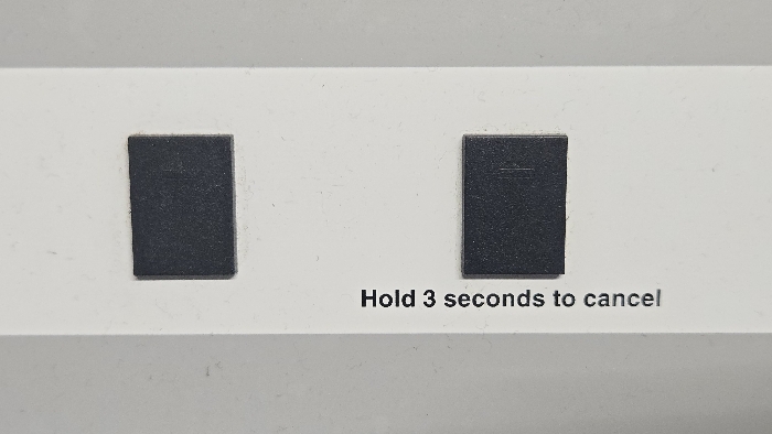 A close-up image displays a light grey, slightly textured panel surface. Two identical, dark grey, rectangular elements are positioned horizontally in the upper-left quadrant, appearing to be buttons or indicators. Each rectangular element measures approximately 1.5 cm in height and 1 cm in width, with subtle vertical striations visible on their surfaces, particularly the right one. Below and to the right of these elements, black sans-serif text reads, "Hold 3 seconds to cancel." The light grey panel exhibits minor surface imperfections consistent with use, such as small smudges and faint scratches. No people or specific actions are depicted. The exact location within Lompoc, United States, cannot be determined from the provided image.