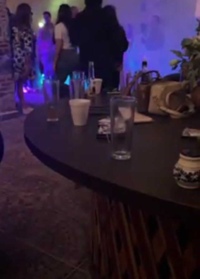 scene at a party. People are dancing in the background, illuminated by blue and green lights and haze. In the foreground is a dark, round table with several empty glasses, a white cup, and a small decorative object. There's also a handbag on the table. The room has a stone wall visible on the left, and the floor appears to be tiled. The focus is on the table and its contents, with the dancing figures slightly blurred in the distance.