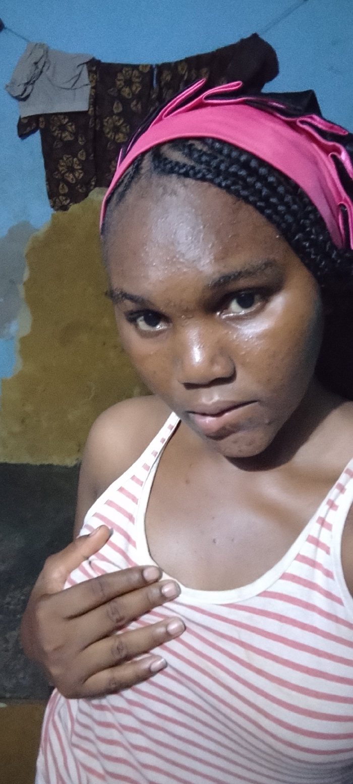 A young woman with dark skin and braided hair, adorned with a pink satin headband, gazes at the camera. She wears a white tank top with pink stripes and rests her hand near her shoulder. The background shows a partly yellow-painted wall next to a blue wall, with clothes hanging in the corner. The overall lighting is dim.