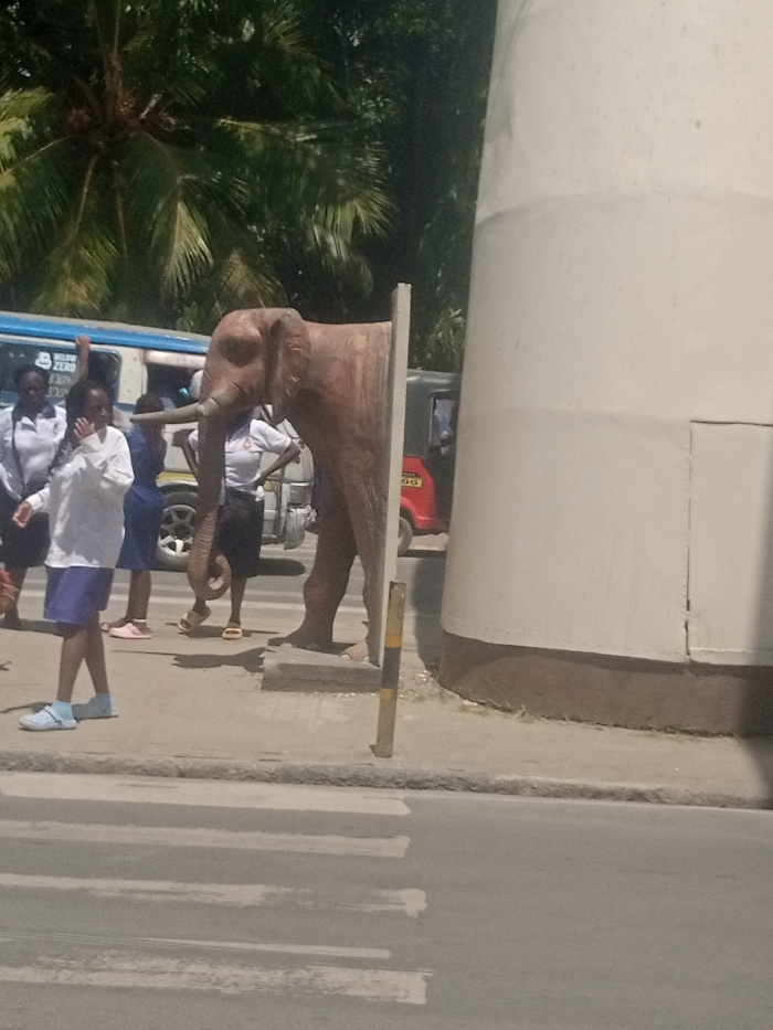 The scene depicts an outdoor urban environment, consistent with Ganjoni/Shimanzi ward, Kenya, under clear, bright daylight. A reddish-brown elephant statue, featuring tusks and a trunk curled inward, is positioned on a grey paved sidewalk. The statue appears to be partially emerging from a vertical, flat, light-colored rectangular panel to its left. Adjacent to the elephant statue on the right stands a large, light-colored cylindrical structure with a darker brown base, also on the sidewalk. A short, yellow and black striped bollard is present near the base of this structure. In the immediate foreground, a young individual, likely female, wearing a white long-sleeved shirt, blue shorts, and light blue shoes with light grey socks, walks towards the left, holding a mobile phone to the side of their face. Behind this individual and the elephant statue, several other pedestrians are visible; one in a white collared shirt and dark skirt, another in a dark blue uniform with an arm raised, and additional obscured figures. An asphalt road runs across the foreground, marked with white pedestrian crossing stripes. On the road, a blue and white public transport vehicle (matatu) with "BELOW ZERO" inscribed on its side is visible behind the pedestrians. A red three-wheeled auto-rickshaw (tuk-tuk) is partially visible further back, behind the elephant statue and the large cylindrical structure. Lush green foliage, including palm trees, forms the background. Strong shadows indicate bright sunlight.