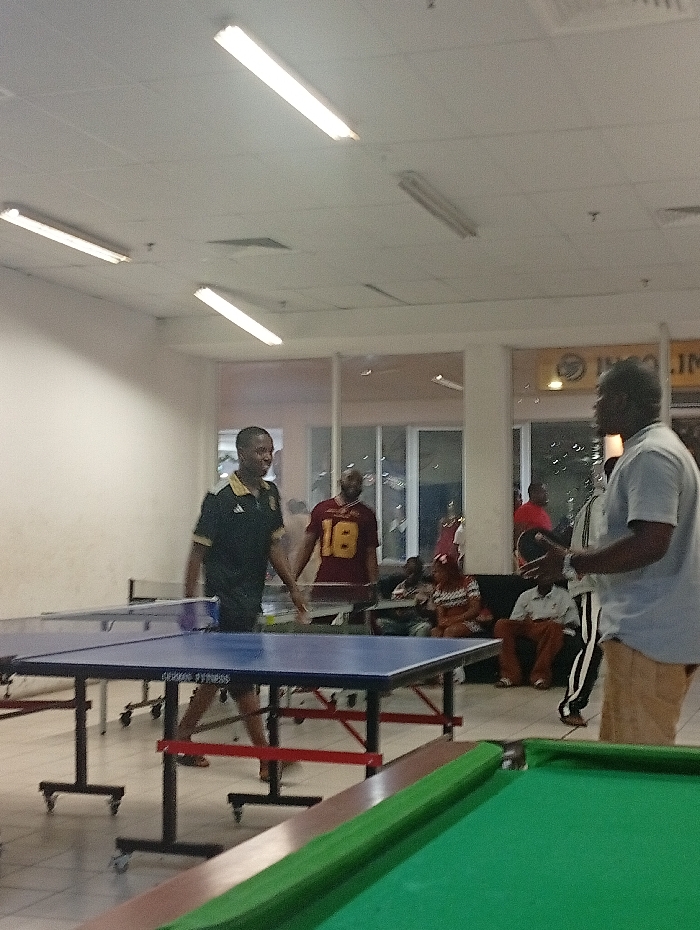 This image depicts an indoor recreational area within the city of Onitsha, Nigeria, featuring multiple gaming tables and a group of individuals